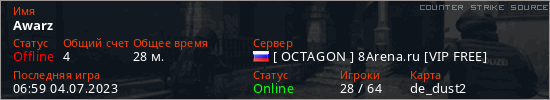 Играет на Counter Strike Source сервере. Страна: РоссияПервый раз замечен 18:53 20.03.2023