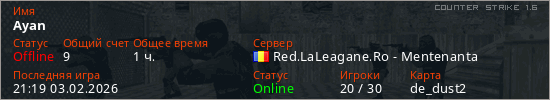 Играет на Counter Strike 1.6 сервере. Страна: РумынияПервый раз замечен 00:47 07.06.2023