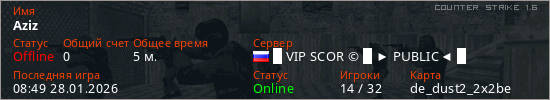 Играет на Counter Strike 1.6 сервере. Страна: РоссияПервый раз замечен 08:47 28.01.2026