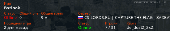 Играет на Counter Strike 1.6 сервере. Страна: РоссияПервый раз замечен 18:08 15.03.2026