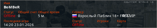 Играет на Counter Strike 1.6 сервере. Страна: РоссияПервый раз замечен 14:14 23.01.2026