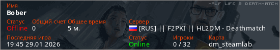 Играет на Half Life 2 DeathMatch сервере. Страна: РоссияПервый раз замечен 19:40 29.01.2026