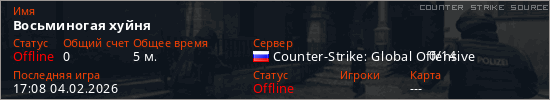 Играет на Counter Strike Source сервере. Страна: РоссияПервый раз замечен 17:03 04.02.2026