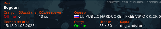 Играет на Counter Strike Global Offensive сервере. Страна: РоссияПервый раз замечен 01:02 01.03.2025