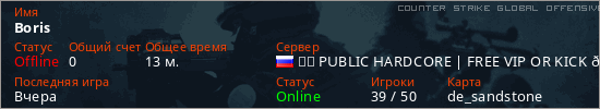 Играет на Counter Strike Global Offensive сервере. Страна: РоссияПервый раз замечен 12:29 04.01.2026