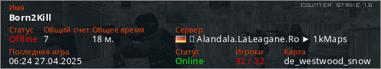 Последний раз был в сети 06:24 27.04.2025 Игрок с таким ником замечен на 6 серверах