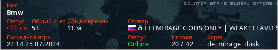 Играет на Counter Strike Global Offensive сервере. Страна: РоссияПервый раз замечен 19:39 24.07.2024