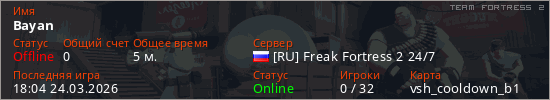 Играет на Team Fortress 2 сервере. Страна: РоссияПервый раз замечен 18:02 24.03.2026