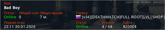 Играет на Counter Strike Source сервере. Страна: РоссияПервый раз замечен 23:11 30.01.2026