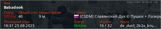 Играет на Counter Strike 1.6 сервере. Страна: РоссияПервый раз замечен 18:46 25.08.2025