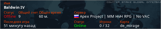 Играет на Counter Strike Global Offensive сервере. Страна: РоссияПервый раз замечен 19:51 22.04.2026