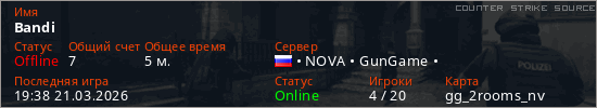 Играет на Counter Strike Source сервере. Страна: РоссияПервый раз замечен 19:19 21.03.2026