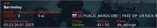 Играет на Counter Strike Global Offensive сервере. Страна: РоссияПервый раз замечен 02:02 26.01.2025