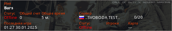 Играет на Call of Duty 4: Modern Warfare сервере. Страна: РоссияПервый раз замечен 01:25 30.01.2025