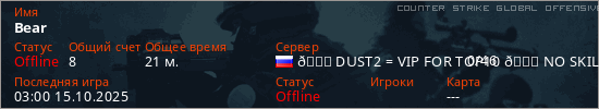 Играет на Counter Strike Global Offensive сервере. Страна: РоссияПервый раз замечен 22:00 28.02.2025