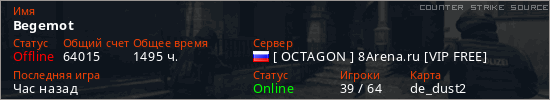 Играет на Counter Strike Source сервере. Страна: РоссияПервый раз замечен 11:23 05.10.2020