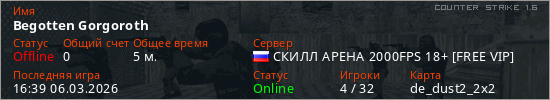Играет на Counter Strike 1.6 сервере. Страна: РоссияПервый раз замечен 16:32 06.03.2026