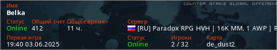Играет на Counter Strike Global Offensive сервере. Страна: РоссияПервый раз замечен 19:40 03.06.2025