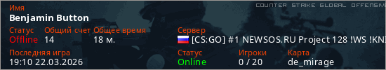 Играет на Counter Strike Global Offensive сервере. Страна: РоссияПервый раз замечен 14:58 22.03.2026