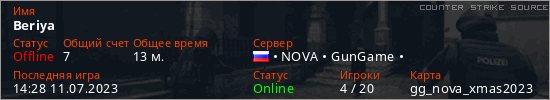 Играет на Counter Strike Source сервере. Страна: РоссияПервый раз замечен 14:32 10.07.2023