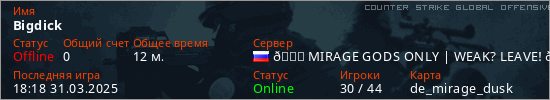 Играет на Counter Strike Global Offensive сервере. Страна: РоссияПервый раз замечен 18:11 31.03.2025