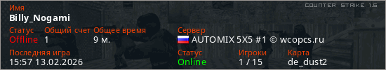 Играет на Counter Strike 1.6 сервере. Страна: РоссияПервый раз замечен 15:56 03.02.2026