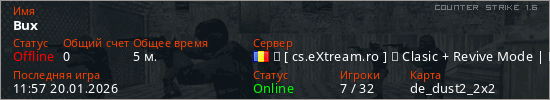 Играет на Counter Strike 1.6 сервере. Страна: РумынияПервый раз замечен 11:55 20.01.2026