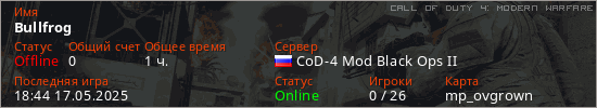 Играет на Call of Duty 4: Modern Warfare сервере. Страна: РоссияПервый раз замечен 16:28 07.01.2025