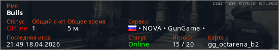 Играет на Counter Strike Source сервере. Страна: РоссияПервый раз замечен 21:47 18.04.2026