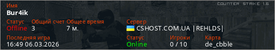 Играет на Counter Strike 1.6 сервере. Страна: УкраинаПервый раз замечен 16:44 06.03.2026
