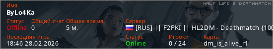 Играет на Half Life 2 DeathMatch сервере. Страна: РоссияПервый раз замечен 18:44 28.02.2026