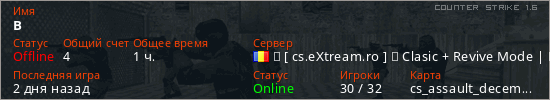 Играет на Counter Strike 1.6 сервере. Страна: РумынияПервый раз замечен 19:28 12.11.2024