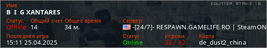 Играет на Counter Strike 1.6 сервере. Страна: СШАПервый раз замечен 03:30 12.04.2025