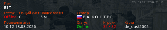 Играет на Counter Strike 1.6 сервере. Страна: РоссияПервый раз замечен 09:59 13.03.2026