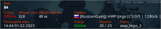 Играет на Counter Strike Global Offensive сервере. Страна: РоссияПервый раз замечен 21:31 29.01.2025