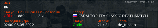 Играет на Counter Strike 1.6 сервере. Страна: РоссияПервый раз замечен 23:15 20.07.2021