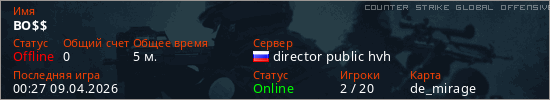 Играет на Counter Strike Global Offensive сервере. Страна: РоссияПервый раз замечен 00:23 09.04.2026