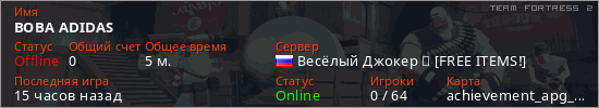 Играет на Team Fortress 2 сервере. Страна: РоссияПервый раз замечен 09:20 09.03.2026