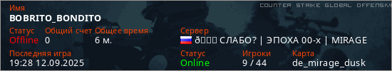 Играет на Counter Strike Global Offensive сервере. Страна: РоссияПервый раз замечен 19:02 12.09.2025