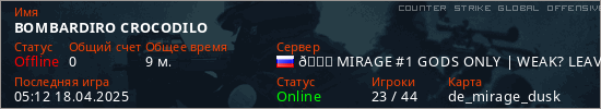 Играет на Counter Strike Global Offensive сервере. Страна: РоссияПервый раз замечен 03:29 18.04.2025