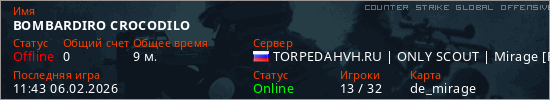 Играет на Counter Strike Global Offensive сервере. Страна: РоссияПервый раз замечен 10:56 06.02.2026