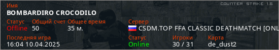 Играет на Counter Strike 1.6 сервере. Страна: РоссияПервый раз замечен 16:21 24.03.2025
