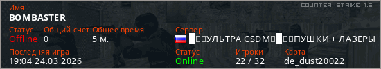 Играет на Counter Strike 1.6 сервере. Страна: РоссияПервый раз замечен 19:02 24.03.2026