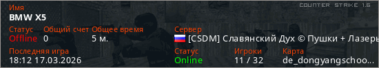 Играет на Counter Strike 1.6 сервере. Страна: РоссияПервый раз замечен 18:08 17.03.2026