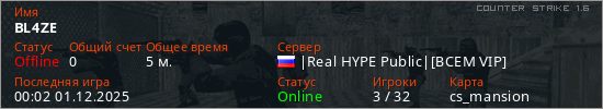 Играет на Counter Strike 1.6 сервере. Страна: РоссияПервый раз замечен 23:58 30.11.2025