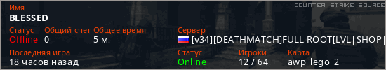 Играет на Counter Strike Source сервере. Страна: РоссияПервый раз замечен 23:04 05.12.2025