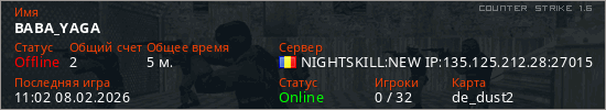 Играет на Counter Strike 1.6 сервере. Страна: РумынияПервый раз замечен 10:54 08.02.2026