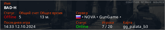 Играет на Counter Strike Source сервере. Страна: РоссияПервый раз замечен 21:40 23.05.2024