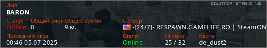 Последний раз был в сети 00:46 05.07.2025 Игрок с таким ником замечен на 33 серверах