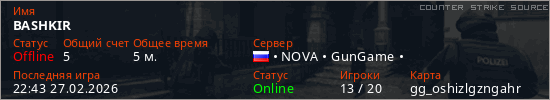 Играет на Counter Strike Source сервере. Страна: РоссияПервый раз замечен 22:24 27.02.2026